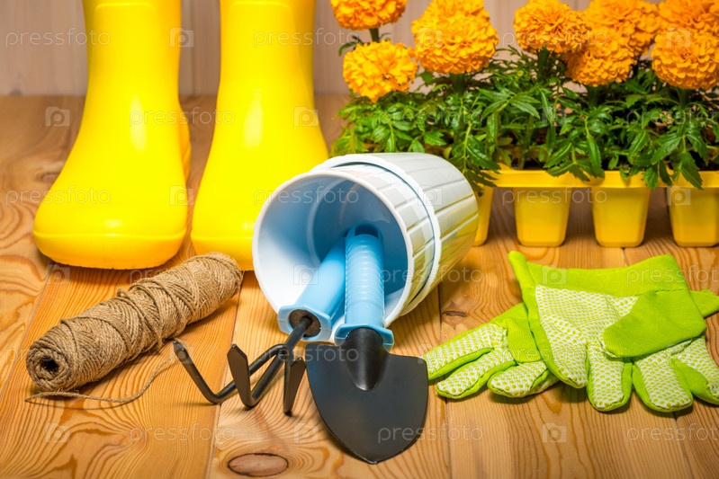 Садовые инструменты для садоводства, резиновые сапоги и саженцы, весенняя концепция - сезонные садовые работы