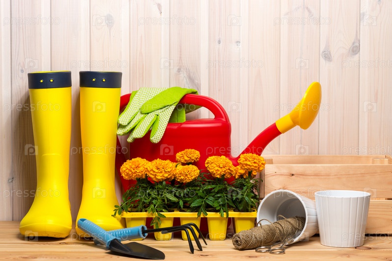 Весенняя концепция, садовые инструменты для садоводства, резиновые сапоги и саженцы, лейка, сезонные садовые работы