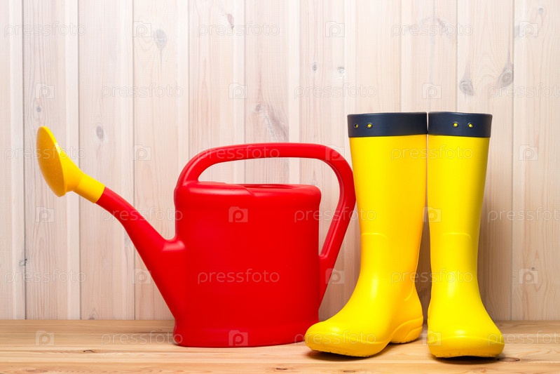 Красная лейка и желтые сапоги концепция садоводства