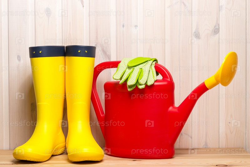 Резиновые сапоги, лейка и садовые перчатки весной предметы на деревянном фоне