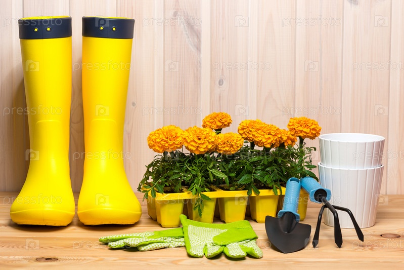Садовые инструменты для садоводства, резиновые сапоги и саженцы, весенняя концепция - сезонные садовые работы