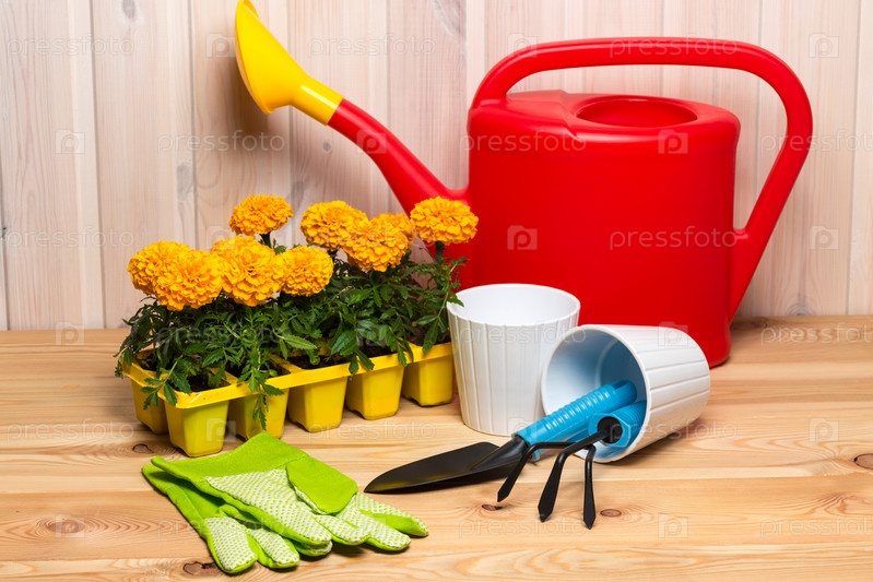 Весенняя концепция, садовые инструменты для садоводства и рассады, лейка, сезонные садовые работы