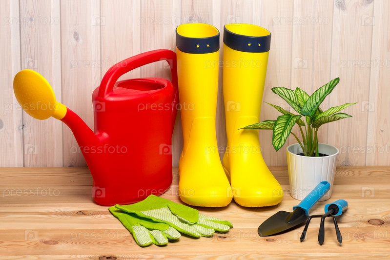 Весенняя концепция, садовые инструменты для садоводства, резиновые сапоги и саженцы, лейка, сезонные садовые работы
