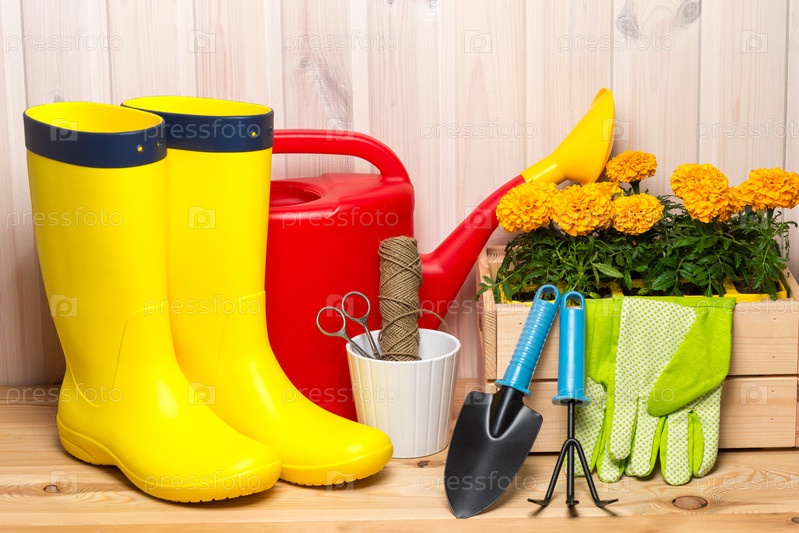 Весенняя концепция, садовые инструменты для садоводства, резиновые сапоги и саженцы, лейка, сезонные садовые работы