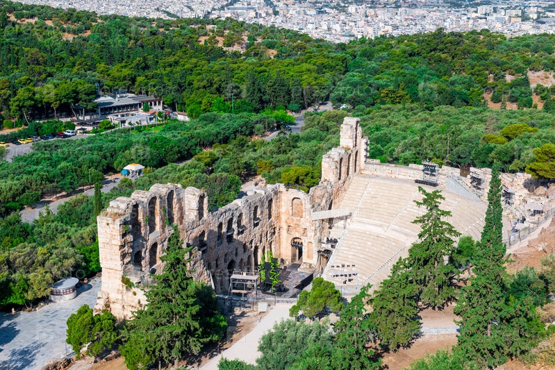 Древний Одеон Герода Аттика в Афинах, Греция на холме Акрополя