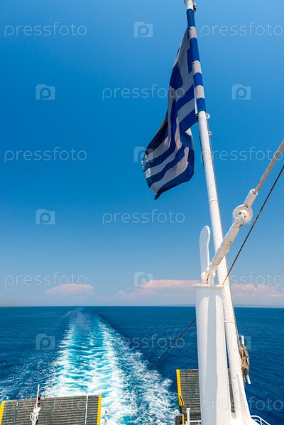 Тропа на поверхности воды за круизным лайнером и флагом Греции