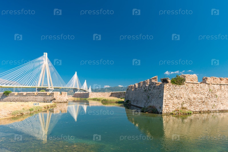 Живописный вид на венецианскую крепость Замок Рио в Греции, недалеко от моста Рио-Антирио, пересекающего пролив Коринфского залива, Пелопоннес, Греция
