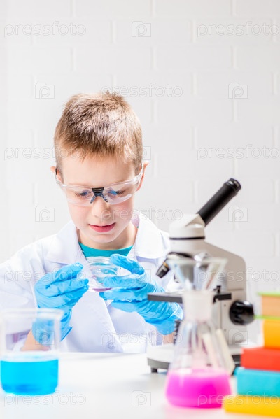Школьник с микроскопом рассматривает химические вещества в пробирках, проводит опыты – портрет на белом фоне. Концепция исследования коронавируса в лаборатории