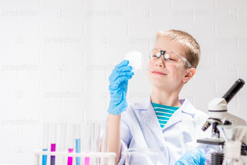 Школьник с микроскопом рассматривает химические вещества в пробирках, проводит опыты – портрет на белом фоне. Концепция исследования коронавируса в лаборатории