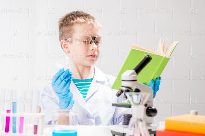 Школьник с микроскопом и книгой исследует химические вещества в пробирках, проводит эксперименты - портрет на белом фоне. Концепция исследования коронавируса в лаборатории