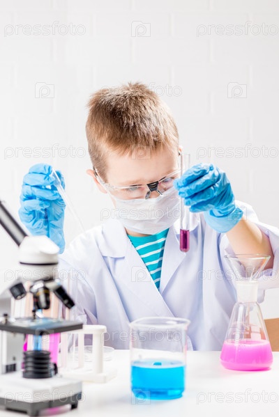 Школьник с микроскопом рассматривает химические вещества в пробирках, проводит опыты – портрет на белом фоне. Концепция исследования коронавируса в лаборатории