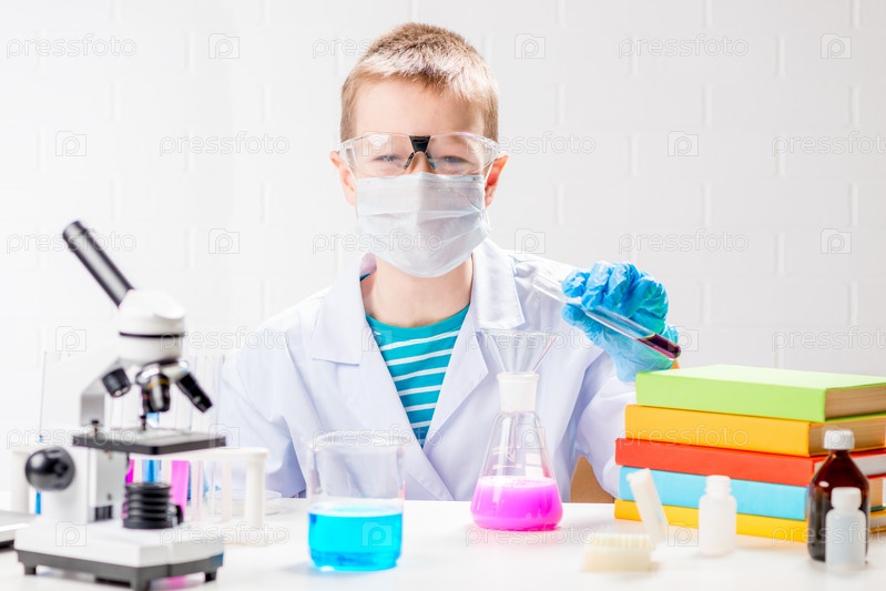 Школьник с микроскопом и книгой исследует химические вещества в пробирках, проводит эксперименты - портрет на белом фоне. Концепция исследования коронавируса в лаборатории
