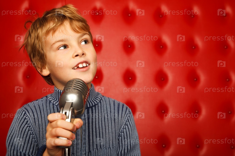 Портрет мальчика с микрофоном на красном фоне
