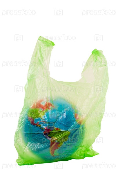 Маленький земной шар планеты в полиэтиленовом пакете на белом фоне. Концепция экологии, концепция проблемы загрязнения