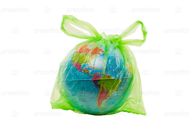Глобус в полиэтиленовом пакете. Земля загрязнена пластиковыми отходами. Концепция пластикового загрязнения и пластиковых отходов