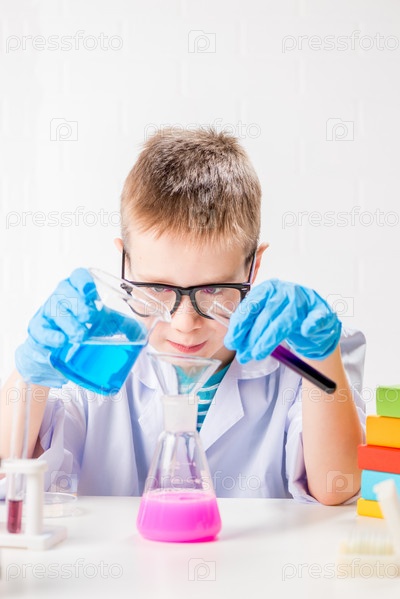 Школьник изучает в пробирках разноцветные вещества, проводит опыты – портрет на белом фоне. Концепция исследования коронавируса в лаборатории