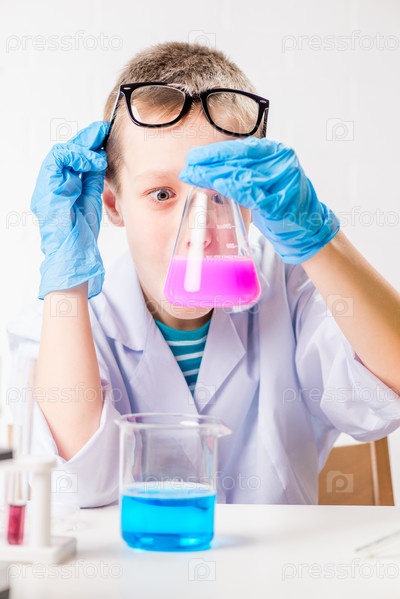 Школьник изучает в пробирках разноцветные вещества, проводит опыты – портрет на белом фоне. Концепция исследования коронавируса в лаборатории