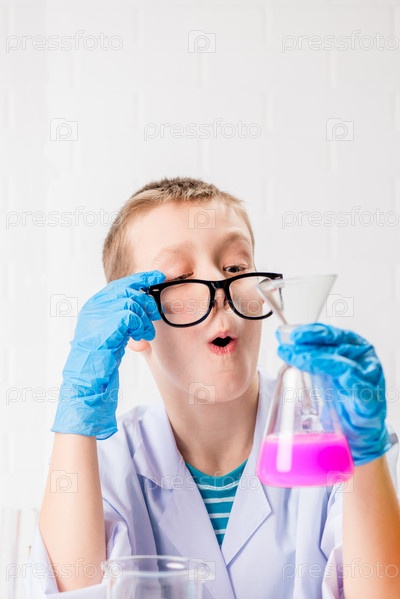 Школьник изучает в пробирках разноцветные вещества, проводит опыты – портрет на белом фоне. Концепция исследования коронавируса в лаборатории