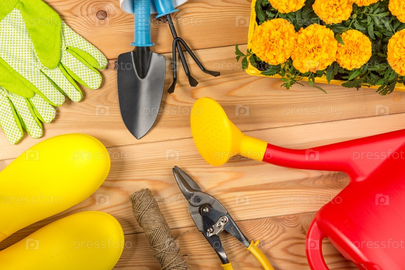 Резиновые сапоги, лейка, цветы и садовые инструменты вид сверху концепция садоводства