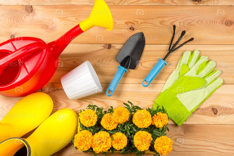 Резиновые сапоги, лейка, цветы и садовые инструменты вид сверху концепция садоводства