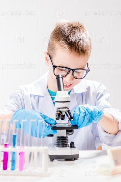 Школьник с микроскопом рассматривает химические вещества в пробирках, проводит опыты – портрет на белом фоне. Концепция исследования коронавируса в лаборатории