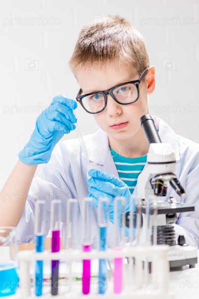 Школьник с микроскопом рассматривает химические вещества в пробирках, проводит опыты – портрет на белом фоне. Концепция исследования коронавируса в лаборатории