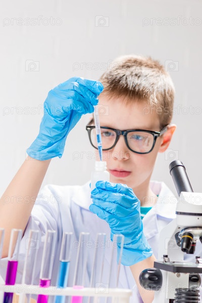 Школьник с микроскопом рассматривает химические вещества в пробирках, проводит опыты – портрет на белом фоне. Концепция исследования коронавируса в лаборатории