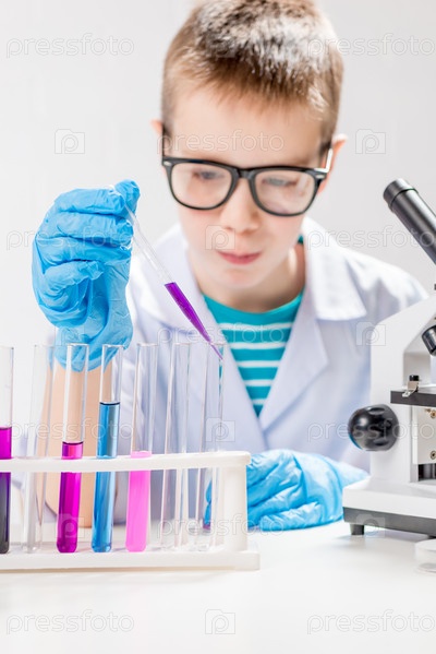Школьник с микроскопом рассматривает химические вещества в пробирках, проводит опыты – портрет на белом фоне. Концепция исследования коронавируса в лаборатории