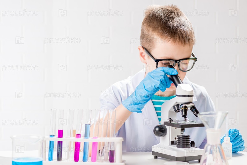 Школьник с микроскопом рассматривает химические вещества в пробирках, проводит опыты – портрет на белом фоне. Концепция исследования коронавируса в лаборатории