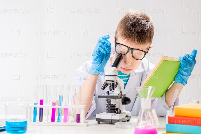 Школьник с микроскопом и книгой исследует химические вещества в пробирках, проводит эксперименты - портрет на белом фоне. Концепция исследования коронавируса в лаборатории
