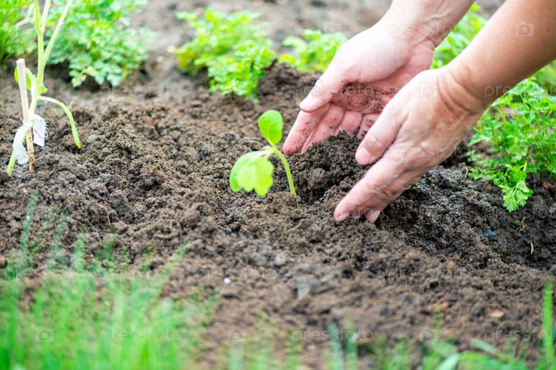 Фермер сажает рассаду огурцов в огороде