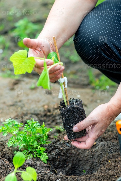 Фермер сажает рассаду огурцов в огороде