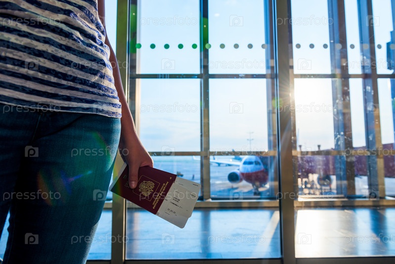 Крупный план женщины с паспортами и посадочным талоном в аэропорту
