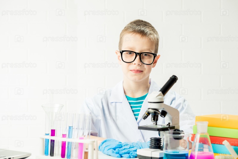 Школьник с микроскопом рассматривает химические вещества в пробирках, проводит опыты – портрет на белом фоне. Концепция исследования коронавируса в лаборатории