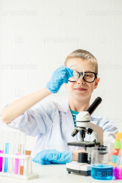 Школьник с микроскопом рассматривает химические вещества в пробирках, проводит опыты – портрет на белом фоне. Концепция исследования коронавируса в лаборатории
