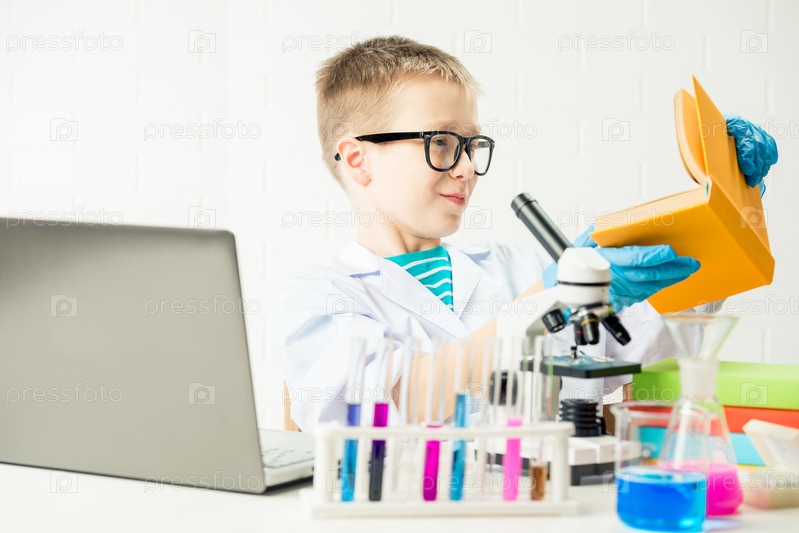 Школьник с микроскопом и книгой исследует химические вещества в пробирках, проводит эксперименты - портрет на белом фоне. Концепция исследования коронавируса в лаборатории