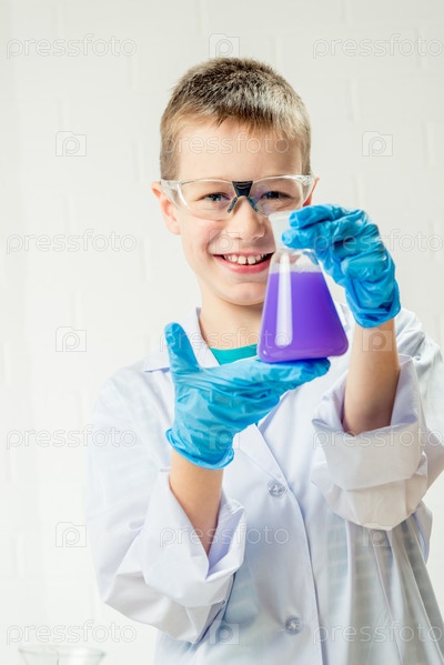 Школьник изучает в пробирках разноцветные вещества, проводит опыты – портрет на белом фоне. Концепция исследования коронавируса в лаборатории