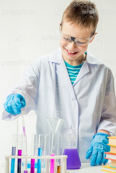 Школьник изучает в пробирках разноцветные вещества, проводит опыты – портрет на белом фоне. Концепция исследования коронавируса в лаборатории