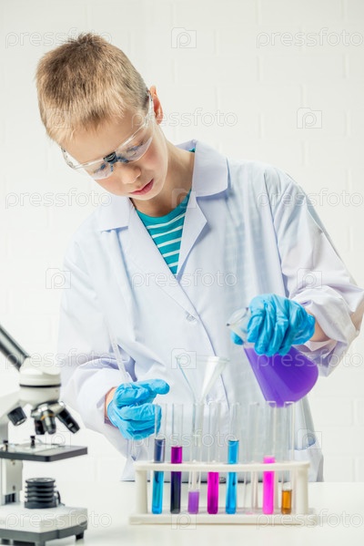 Школьник с микроскопом рассматривает химические вещества в пробирках, проводит опыты – портрет на белом фоне. Концепция исследования коронавируса в лаборатории