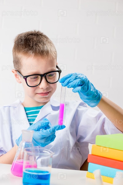 Школьник изучает в пробирках разноцветные вещества, проводит опыты – портрет на белом фоне. Концепция исследования коронавируса в лаборатории