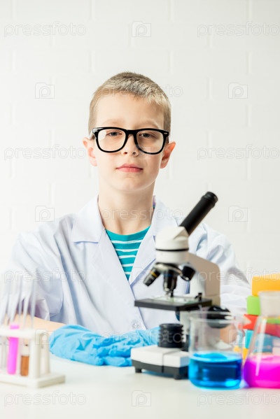 Школьник с микроскопом рассматривает химические вещества в пробирках, проводит опыты – портрет на белом фоне. Концепция исследования коронавируса в лаборатории