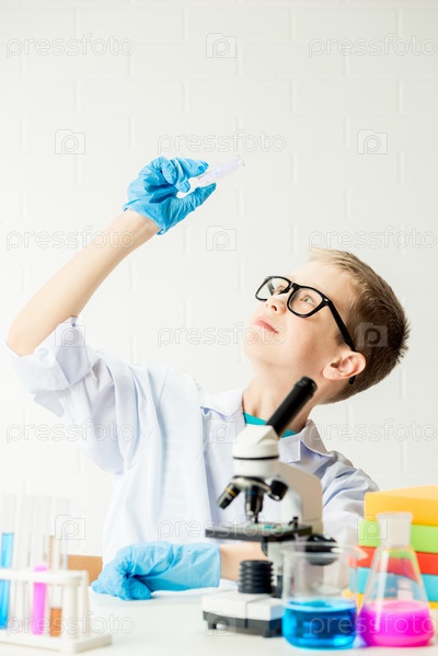Школьник с микроскопом рассматривает химические вещества в пробирках, проводит опыты – портрет на белом фоне. Концепция исследования коронавируса в лаборатории