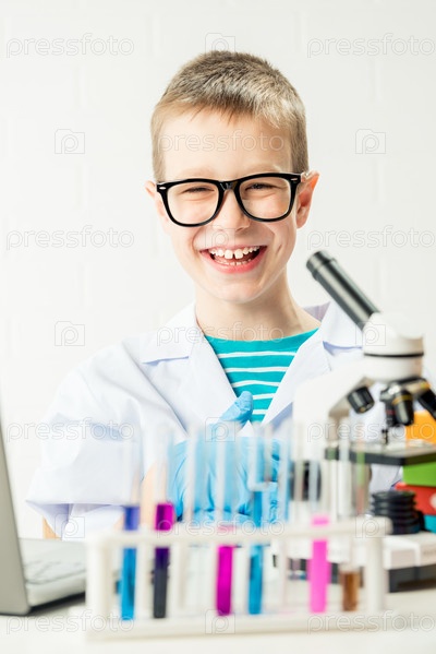 Школьник с микроскопом рассматривает химические вещества в пробирках, проводит опыты – портрет на белом фоне. Концепция исследования коронавируса в лаборатории
