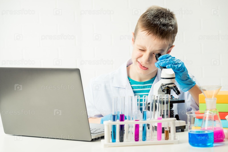 Школьник с ноутбуком в лаборатории проводит химические эксперименты с веществами в пробирках, портрет молодого химика