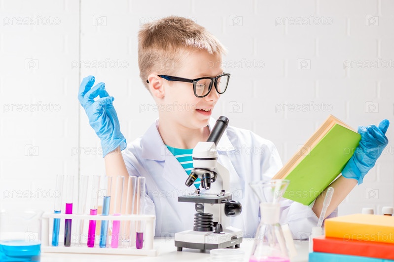 Школьник с микроскопом и книгой исследует химические вещества в пробирках, проводит эксперименты - портрет на белом фоне. Концепция исследования коронавируса в лаборатории