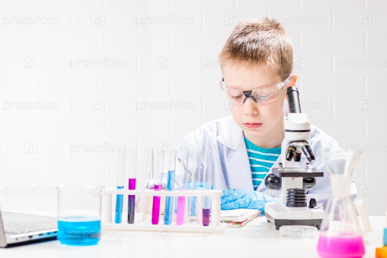 Школьник с микроскопом рассматривает химические вещества в пробирках, проводит опыты – портрет на белом фоне. Концепция исследования коронавируса в лаборатории