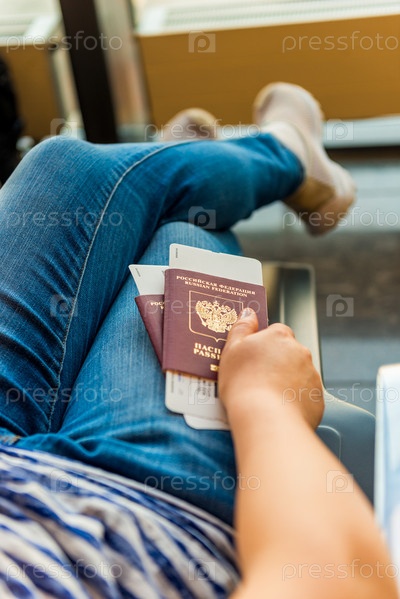 Крупный план женщины с паспортами и посадочным талоном в аэропорту