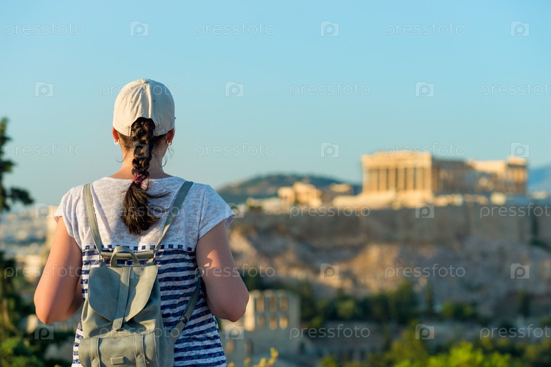 Наслаждаемся отдыхом в Греции. Молодая путешествующая женщина наслаждается видом на Афины и Акрополь