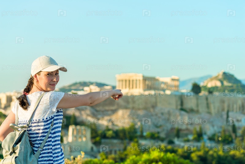 Наслаждаемся отдыхом в Греции. Молодая путешествующая женщина наслаждается видом на Афины и Акрополь