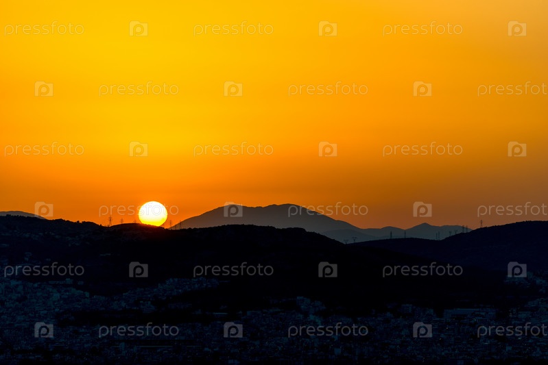 Красивые цвета заката над горами Афины, Греция